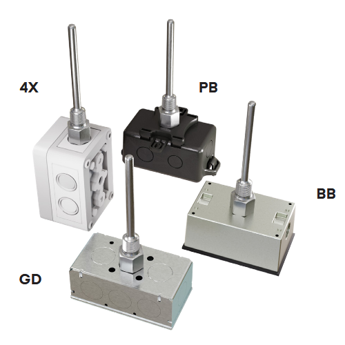 These sensors include a 6-inch (15.24cm) stainless steel probe and a welded thermowell, housed in a selection of enclosures: plenum-rated ABS plastic (PB), galvanized steel (GD), IP66 washdown-rated polystyrene (4X), or outdoor-resistant aluminum (BB). Built to DIN EN 60751 Class A accuracy standards and backed by a 5-Year Limited Warranty.
